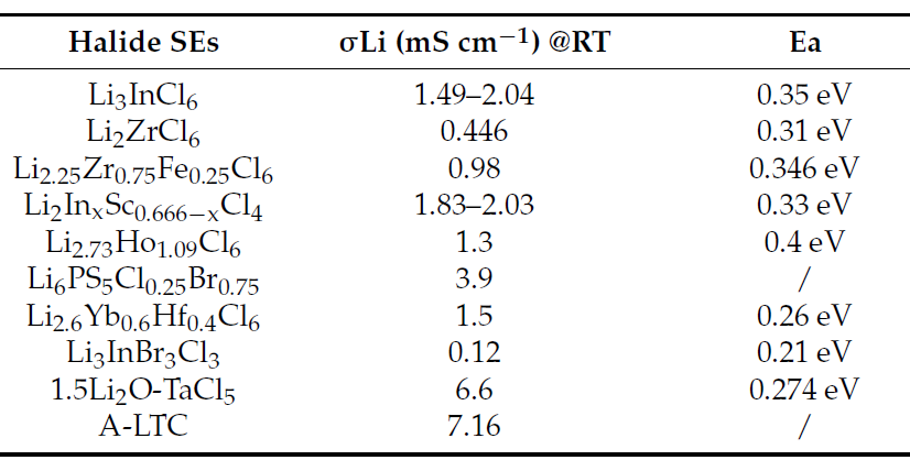 - 할라이드 고체 전해질은 이온 전도율이 10⁻³ S cm⁻¹에 도달할 수 있으며, 이온 반경이 유사한 황화물 이온에 비해 크기 때문에 Li⁺의 이동 상태를 증진시킨다.