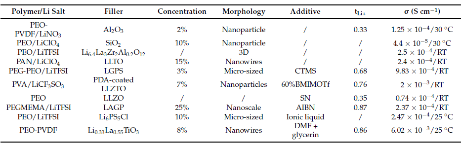 - 유기-무기 복합 고체 전해질(CSEs)은 고분자 매트릭스, 리튬염, 그리고 무기 충전제로 구성되어 있으며, 이들은 전해질과 전극간의 인터페이스 임피던스를 줄여준다 .